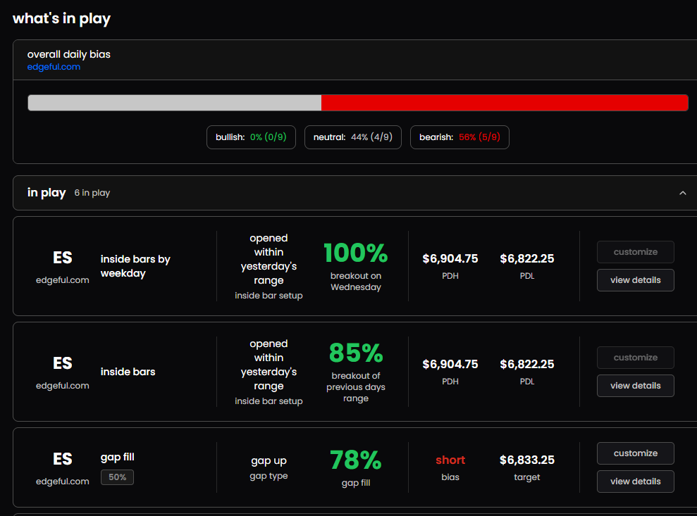 On Wednesday morning, the Edgeful dashboard (the “What’s In Play” tool) gave us a clear statistical roadmap: