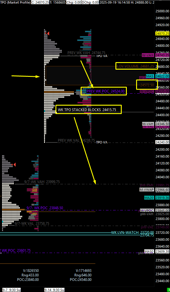 • This is our new daily leg up and a massive spot. It has confluence with a 4-hour at 24,513.00 and a large weekly TPO level at 24,524.00. We really need to hold this for our immediate continuation higher.