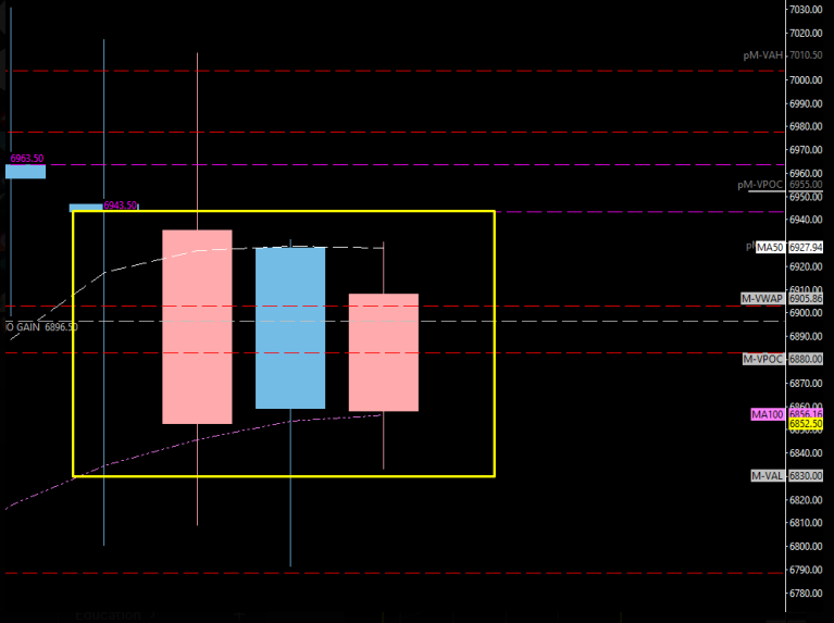 Price is what I would call distributing in a sideways fashion, and we will at some point break out of this, but in which direction is hard to say as of right now. I am currently still leaning to the downside, as many of you know from weeks prior. We sit now below our 6903.00 Weekly, below our major 6883.00 Weekly, and even now below our massive Monthly at 6857.25. We still have current momentum to the downside. Support is extremely thin for untested levels below us, so unless we get a nice sweep play, I do not expect too much support down here to actually play to the upside.