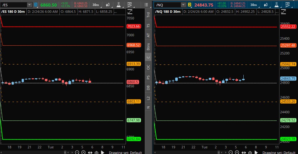 A detailed ES & VIX plan for Feb 24th, breaking down the 6857.25 Monthly Pivot, the 6903.00 Momentum Shift, and the 6794.50 Liquidity Sweep.
