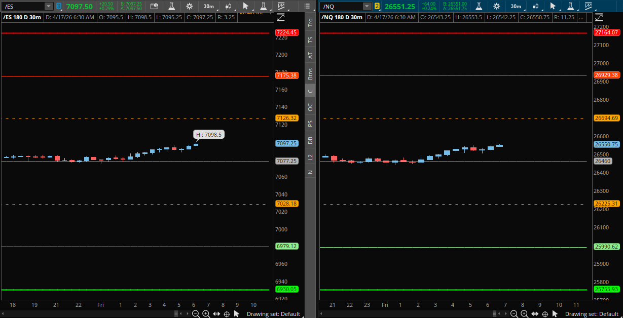 Morning everyone. Today is Friday, April 17th, and we come off another unreal day in the trade plans as we called the retest of the all-time high that was made in Globex. Discord Inner Circle members were able to catch the epic long on the retest of 7056.00, which propelled us all the way to new all-time highs and has kept us moving all night in the overnight session — moving up over fifty points. Congratulations to all those who took advantage of another unreal day in the trade plans as we have captured this relative low-volume upside grind.