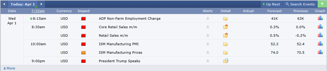 News: Heavy Red Tag news day — pre-market and post-market open. At 8:15 AM ET we have ADP Non-Farm Payroll Change, at 8:30 AM ET we have Core Retail Sales, and at 10:00 AM ET we have ISM Manufacturing PMI. These are all massive news events that are sure to give us a shake. Let this stuff shake out before doing anything.