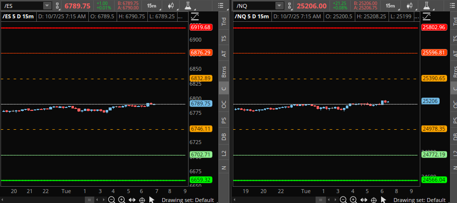 We’ve been drifting all night and are now less than 10 points away from all-time highs. With the government shutdown ongoing, we have no Red Tag News on the calendar this morning. Yesterday was a quiet inside day, with price action contained within the prior day’s range. This suggests the market is balancing and finding value at these elevated levels, and the path of least resistance appears to be higher.
