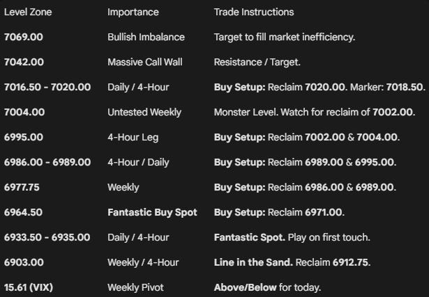 7004.00 (Untested Weekly), 6995.00 (4-Hour / 1-Hour Leg to High), 6991.75 (Weekly VWAP).