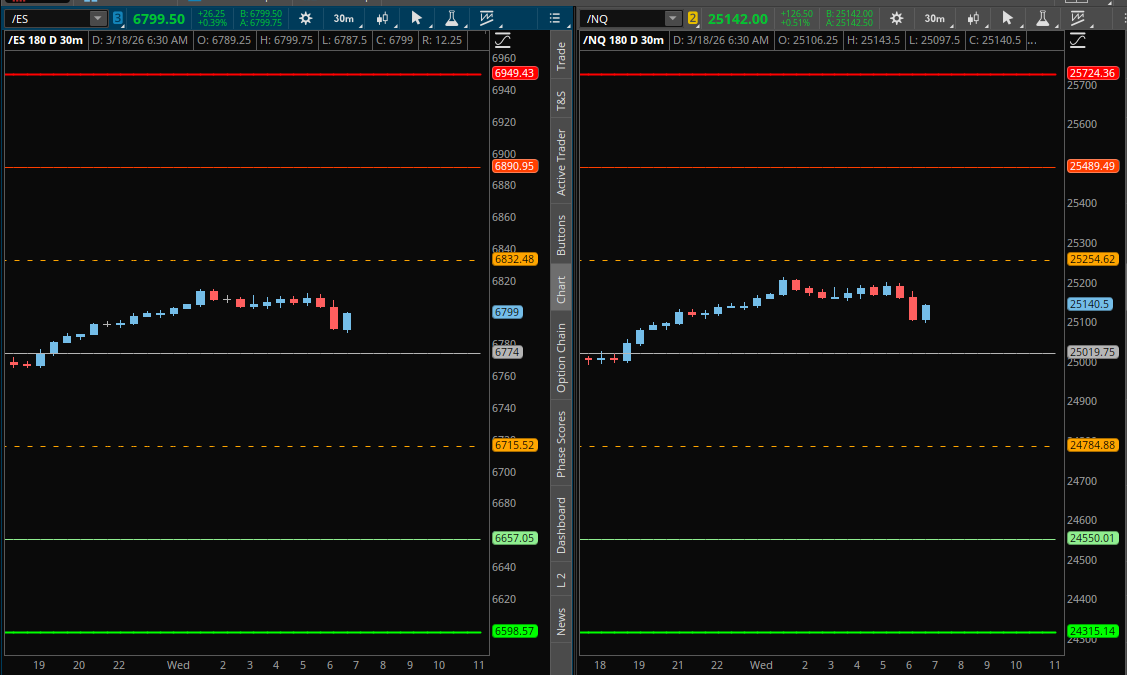 Morning everyone. Today is Wednesday, March 18th, and yesterday the trade plan came through for us once again. As we predicted, holding the 6721.50 Weekly allowed us to push past our 6779.25 4-Hour and continue to move higher. That is exactly what happened. We had a slow grind yesterday as it was one of the first days of rollover, which is not surprising given the lower, disproportionate volume spread out through contracts. We have sat in a balance area all night long due to the market digesting potential FOMC movements. Congratulations to everybody who leaned up toward yesterday’s targets for the trade plan, as it was a quick and short day, but the move was had and we were done early.