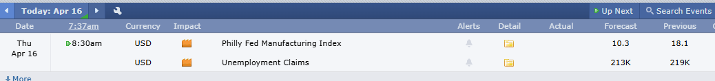 News: No Red Tag news events today. However, we have Philly Fed Manufacturing Index at 8:30 AM and Unemployment Claims also at 8:30 AM. These are not Red Tag events but could give us a shake, so be aware pre-market.
