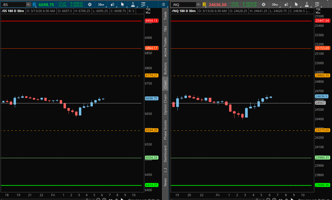 Good morning everyone. Today is Friday, March 13th, and we come off another incredible day in the trade plans. As usual, we called 6761 as our big above/below pivot, and it indeed played exactly as that — being the high of the day. We moved below our 6749.75 4-Hour, traveling all the way lower well past our 6681.50 Daily bottom target. We were also able to play the suppression below our major support in the overnight session, with the Daily at 6723.50 and the Weekly at 6716. It ended up being a fabulous day for trade plan subscribers as we stuck to the levels and printed some cash. Congratulations to all those who took advantage of this.