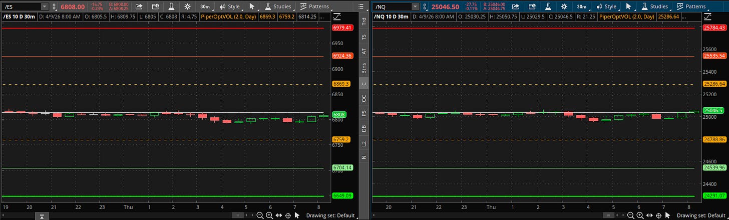 As we come into the day this morning, we have essentially drifted back and forth all night inside yesterday’s range in a very tight fashion as the market remains undecided on direction amid geopolitical news and massive Red Tag headlines. Yesterday, President Trump gave Iran a two-week extension on the ceasefire, which caused what we now know as the “taco trade” — a massive rally as the markets eased in anticipation. However, price has not moved out of this range even in the overnight session. It looks as if we could again open inside yesterday’s range — but this will not stand. The chances of us staying inside yesterday’s range and the overnight range are extremely thin. We should be looking for a push outside of yesterday’s range, one direction or the other, at some point today.
