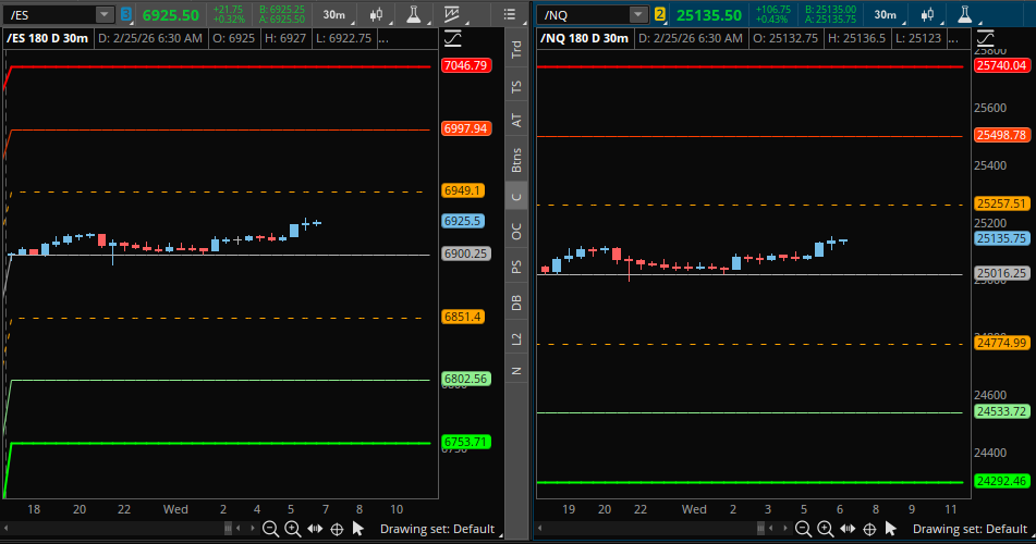 Good morning everyone. Today is Wednesday, February 25th, and we come off an unbeatable day yesterday with the trade plans. We had every single level play out (4) and they paid between 30 and 13 points each! It was a fantastic day for Substack subscribers. We had the low sweep of 6835.00 that essentially squeezed us all day and into our current price now, as well as the rotation off of our famous Weekly at 6883.00 which paid 30 points, amongst other amazing trades yesterday from the plan. Huge congratulations to all those who took advantage of yesterday, for there was some serious money to be made. I once again appreciate all the DMs from everyone telling me how appreciative they are. Let’s continue to do it again today.
