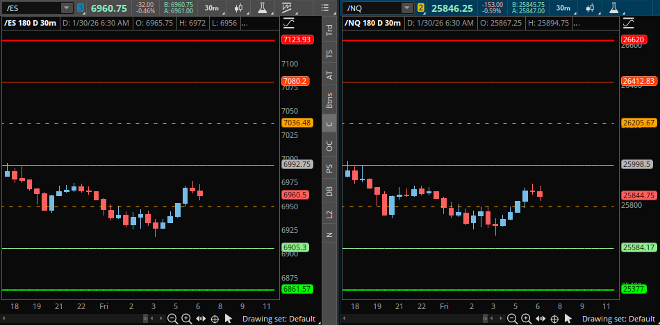 A detailed ES & VIX plan for Jan 30th, breaking down the 6903 Hold, the “Wing Play,” and the Warsh/Tariff Volatility.
