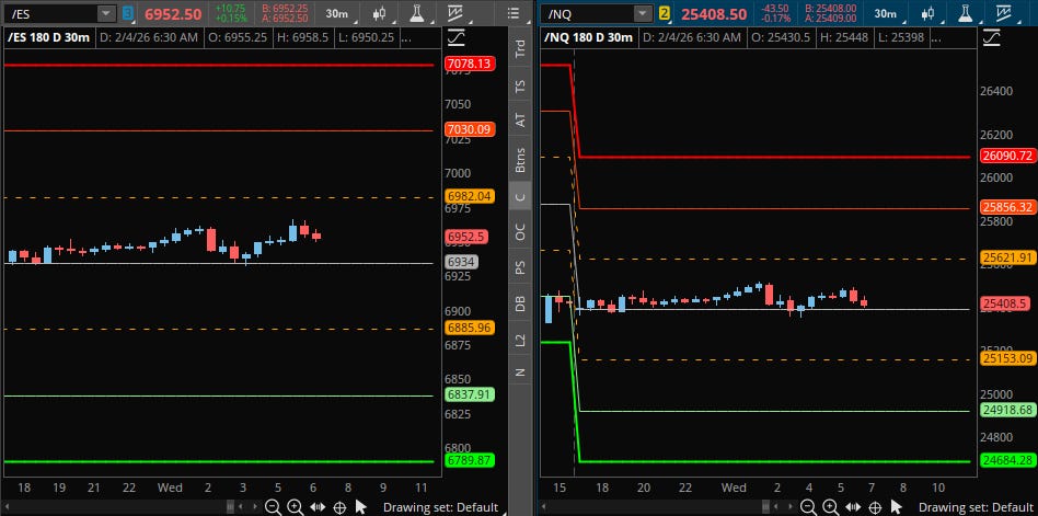 Today is February 4th. We come off of a massive down day yesterday which sparked extreme volatility, sending the VIX up over 20% during the day. Our trade plans led subscribers to know exactly where the key pivots were so they could take advantage of the flip and bias immediately. The push underneath 7004.00, our significant Weekly, told us right from the jump that momentum had shifted to bring us down into the 6957.00 4-Hour, which played for a fabulous 25 points. Then, once again, this was our massive line that was significant for us to be Above/Below, and after price breached this level, it ended up falling another 70 points, paying huge dividends.