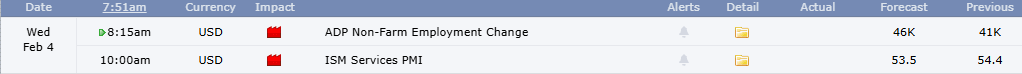 • News: 8:15 AM ADP Non-Farm Employment Change (Red Tag), 10:00 AM ISM Services PMI (Red Tag). Expect a volatility field day.