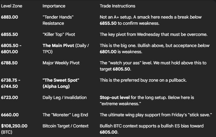 The Main Pivot: 6805.50 This is our big one. This monster daily level will be our main “above/below” pivot and aligns with the 6807.25 TPO POC.