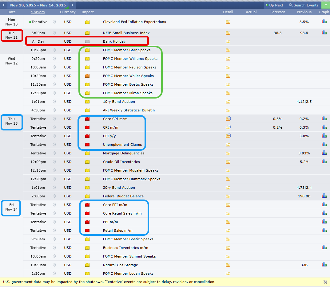 Tuesday: Veterans Day (Bank Holiday). Be aware of this; I haven’t checked the futures market status, but it is a bank holiday.
