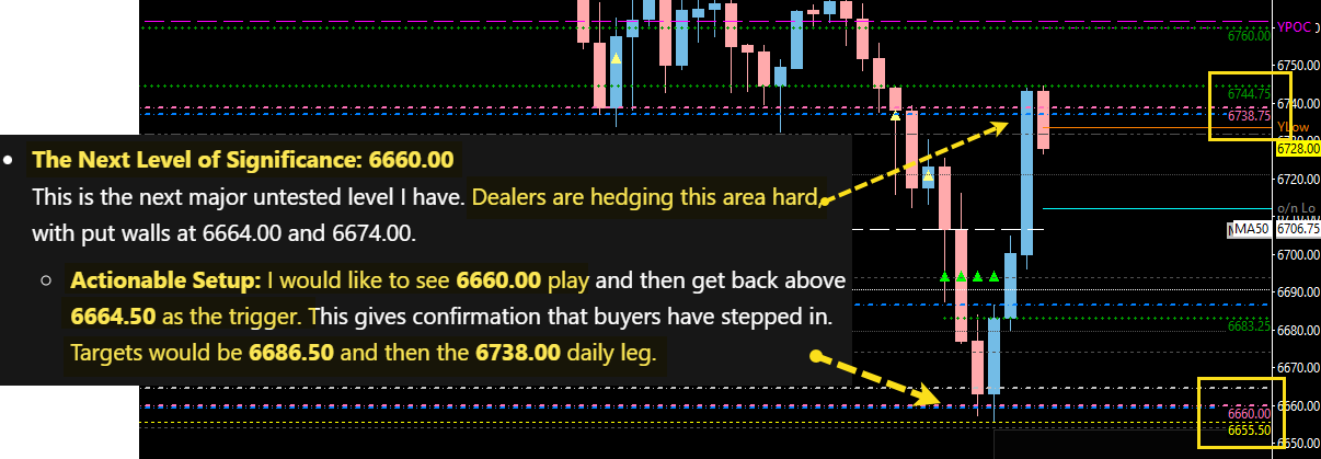This all came together on Friday. The market came all the way down into our major leg end at 6660.00. Our trade plan was clear: “Our big spot here was 6660. Dealers are hedging this area hard... I’d like to see it get over 6660 and then above 6664 is the trigger.” This setup played out perfectly, targeting the 6738.00 daily leg. It moved up to 6744.00 and closed the day at 6765.00—a total of over 105 points from our level.