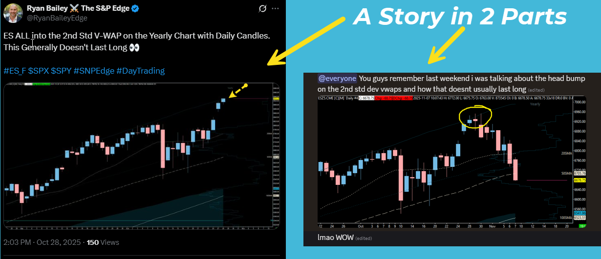 Friday’s price action was absolutely gorgeous. We’ve been talking for about two weeks about how the market was getting stretched out. We noted our very tip-top level was 6950.00, which is exactly what happened by filling the bullish imbalance. I also pointed out that ES was in the second standard deviation on the yearly VWAP, which generally doesn’t last long.