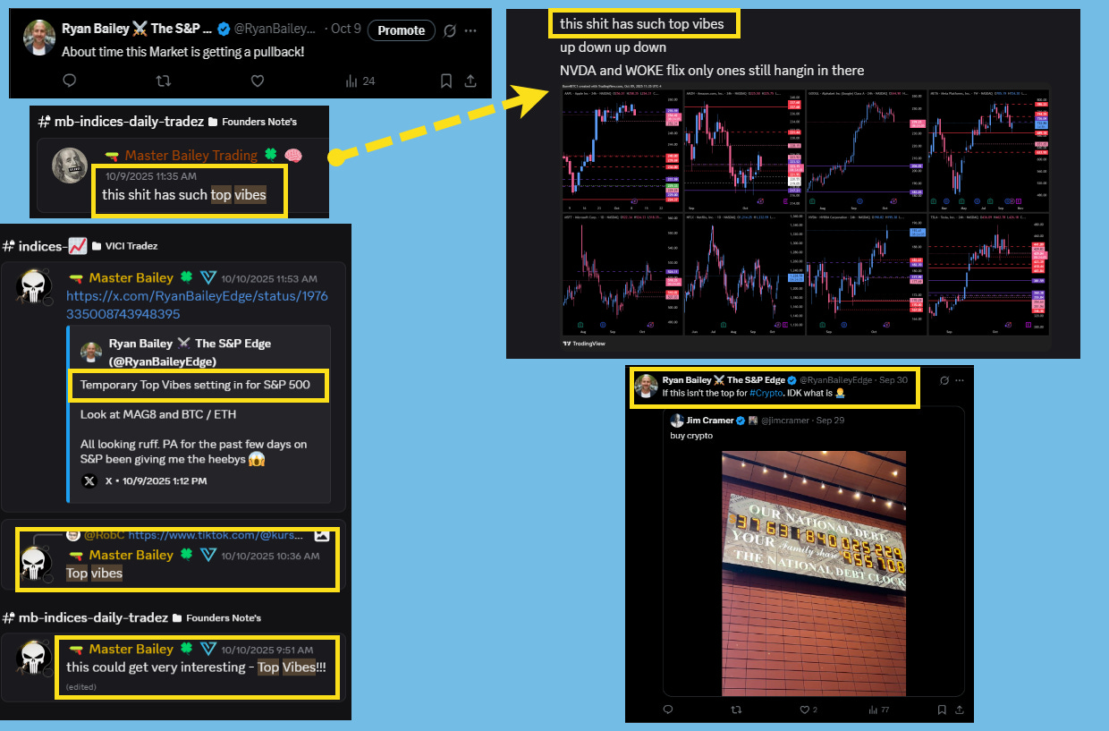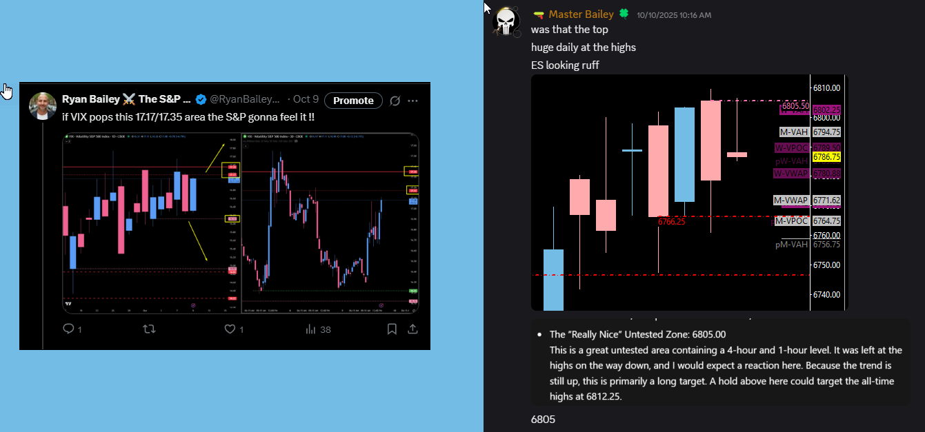 It started on September 30th when I was calling for the top in crypto. Then, on October 9th and 10th, I was tweeting about the “temporary top vibes setting in” for the S&P and the Mag 7. The price action was looking rough, with insane one-hour candles whipping straight up one day and straight down the next. It gave me the heebie-jeebies. On the morning of the drop, I was telling members this could be the high as we hit our 6760 SPX target and filled the excess on the ES profile. We had a pretty good feeling the top was in.
