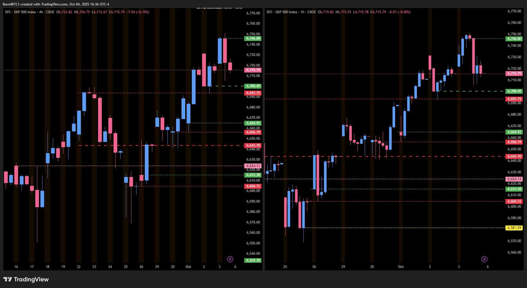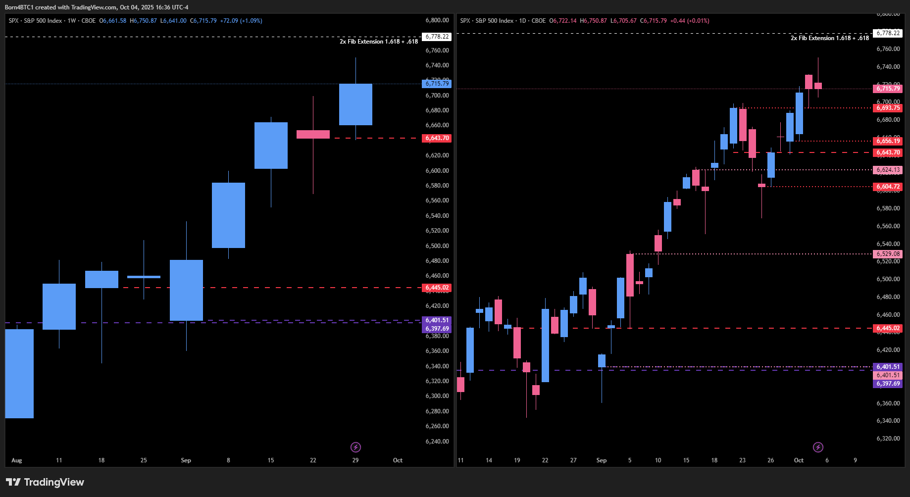 At these all-time highs, we have no structural resistance for context. I did some fib extensions and found a confluence of two different measurements pointing directly to 6778.25. If Friday’s high of 6750.00 doesn’t hold as a temporary top, that fib level is my primary upside target.