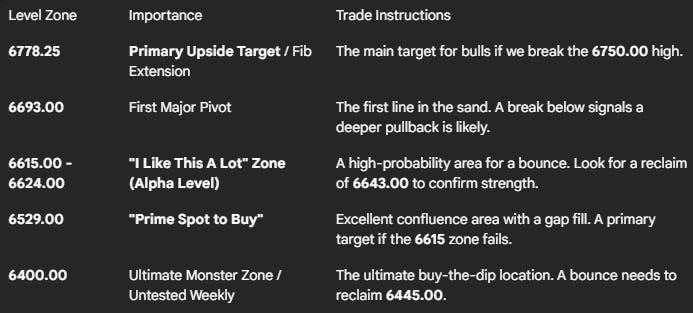 • Actionable Setup: A bounce from here would be valid, but I would look for a push back up and a reclaim of the 6693.00 pivot to confirm buyers have regained control.