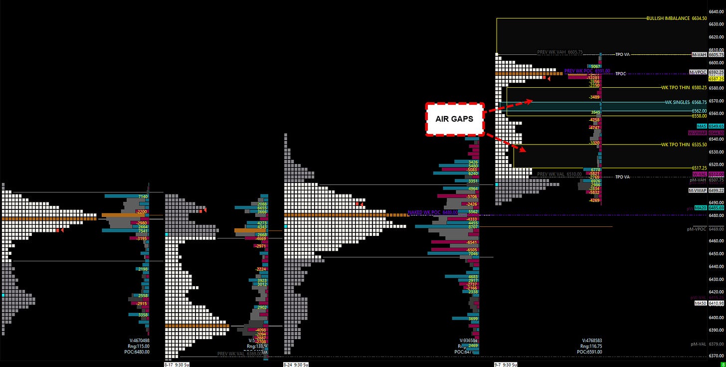 The weekly TPO chart shows why a pullback is likely. We have a bullish imbalance up to 6634.00, but below us, there are "air pockets" of thin volume and single prints. Specifically, a break below the 6583.00 4-hour opens a pocket down to the 6554.00 area. These market inefficiencies will likely get cleaned up at some point. Our job is to be ready at the key untested levels below.