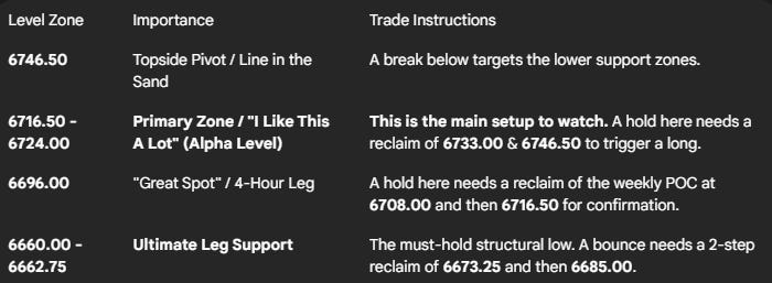 Actionable Setup: If price pulls back into this zone and holds, the trigger for continuation is a move back above the 6733.00 4-hour, and then ultimately a reclaim of the daily at 6746.50.