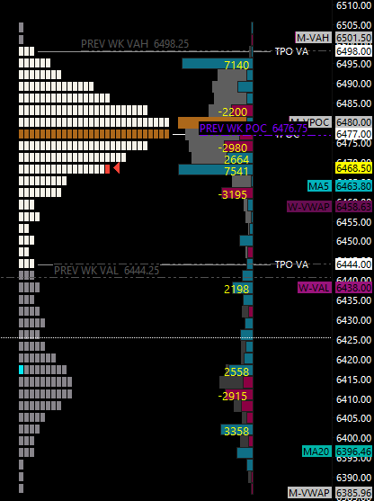 From a broader perspective, the weekly TPO chart shows what appears to be a double distribution profile, and we are currently trading on the lower side of the upper distribution. There is a significant low-volume area just below us, and I anticipate we may slip down to fill that void this week. The critical structural issue is the lack of tested support on the daily and weekly charts below our key pivot. Should the 6425.00 level fail, there is a potential air pocket that could see the market drop over 130 points to find the next major weekly support structure.