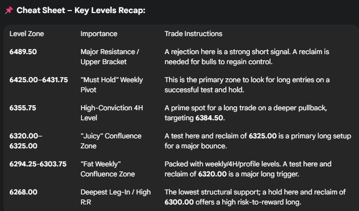 Actionable Setup: While a trade this low carries risk, it offers the best risk-to-reward. The trigger for a major swing long would be a test of this level followed by a reclaim of the 6300.00 - 6302.00 area.