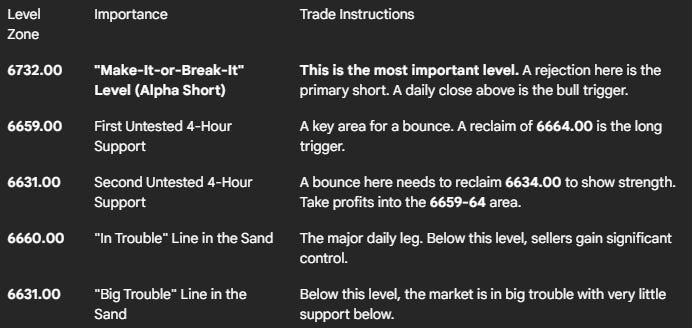It all comes down to 6732.00, people. Put this level on your chart and call it a day. The market has given us a very clear line in the sand. My process says we should be looking for shorts until that level is reclaimed with a daily close. We will be very cautious, as the market is holding the lower structure for now, but the plan is defined.