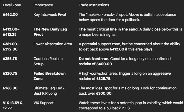 The New Daily Leg Pivot (6412.00 - 6413.25): This is the most immediate and critical line in the sand. This is our new daily leg up. A daily close below this level would be a significant sign of weakness and could send prices much lower, as the structure below is heavily tested.