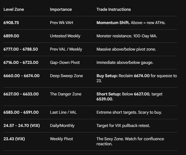 The 106-point gap down has completely shifted our immediate game plan. While the intraday timeframe is bleeding out, do not forget the VIX statistic: a close like Friday’s historically leads to a massive rally within 24-48 hours. We will be watching the 6660.00 - 6674.00 area closely for a sweep and reclaim to get long. Stay patient, stick to the process, and wait for the chart to prove itself before stepping in front of this freight train.