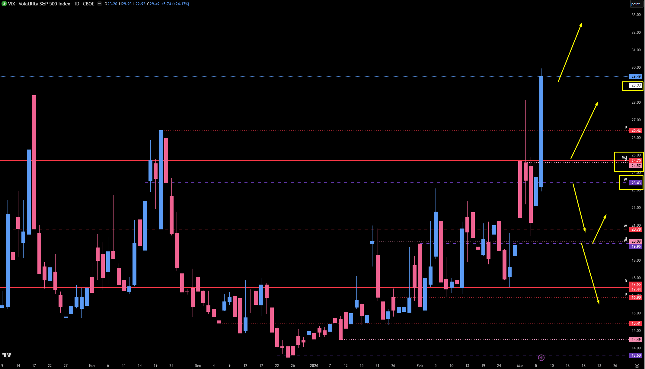 VIX broke out of our 20.78 Weekly, back-tested it, and absolutely launched, sweeping the 28.99 level we discussed on Friday.