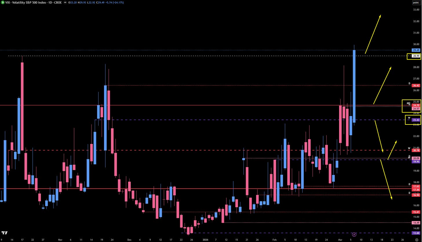 A detailed ES & VIX plan for March 8th, breaking down the 6908.75 shift, the massive VIX 24.70 monthly, and the extreme 6627 support test.