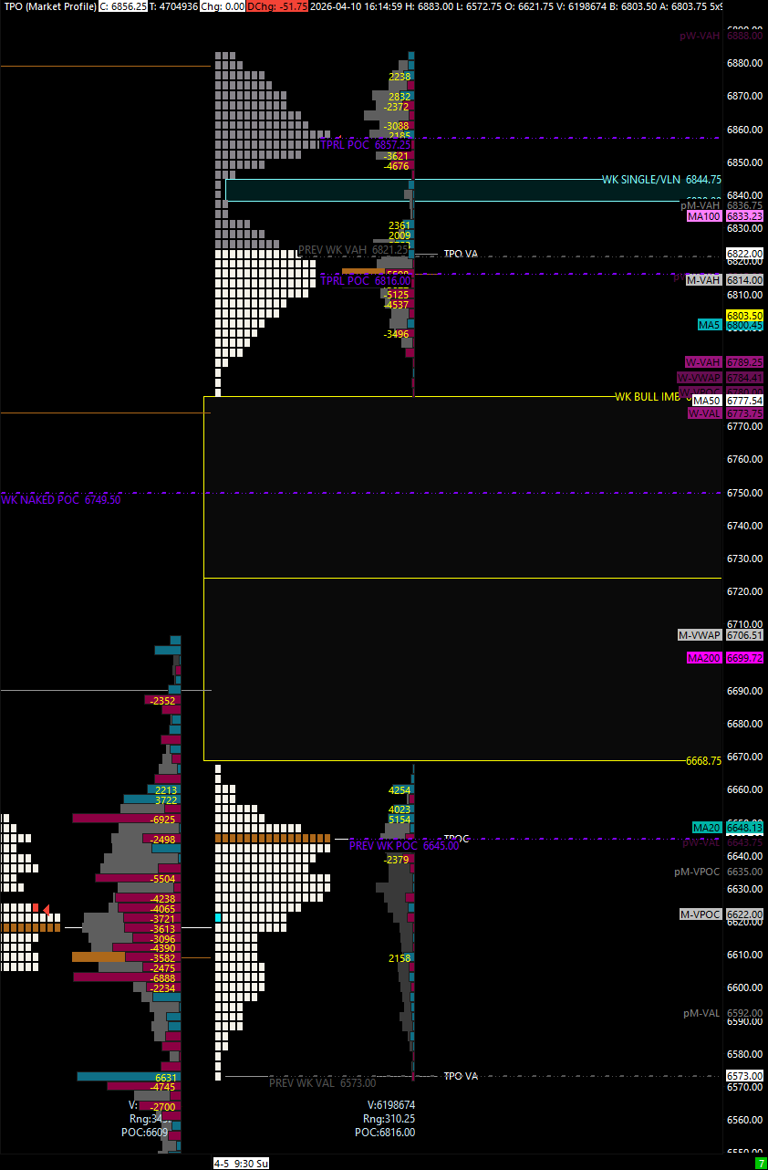 Last week was insane. We had a triple distribution on the weekly TPO profile — I don’t know when the last time I’ve seen one of those. We drew three separate points of control: one at 6816.00, another at 6857.25, and the final one down at 6645.00. The Previous Weekly VAH sits at 6821.00, and there is a low volume node with singles between the distributions that still needs to get filled in. This profile sets us up for a squeeze if we push back up into this area — we could fill that low volume node and come up into 6844.00 to reject, which is dangerously close to our Monthly at 6857.25.