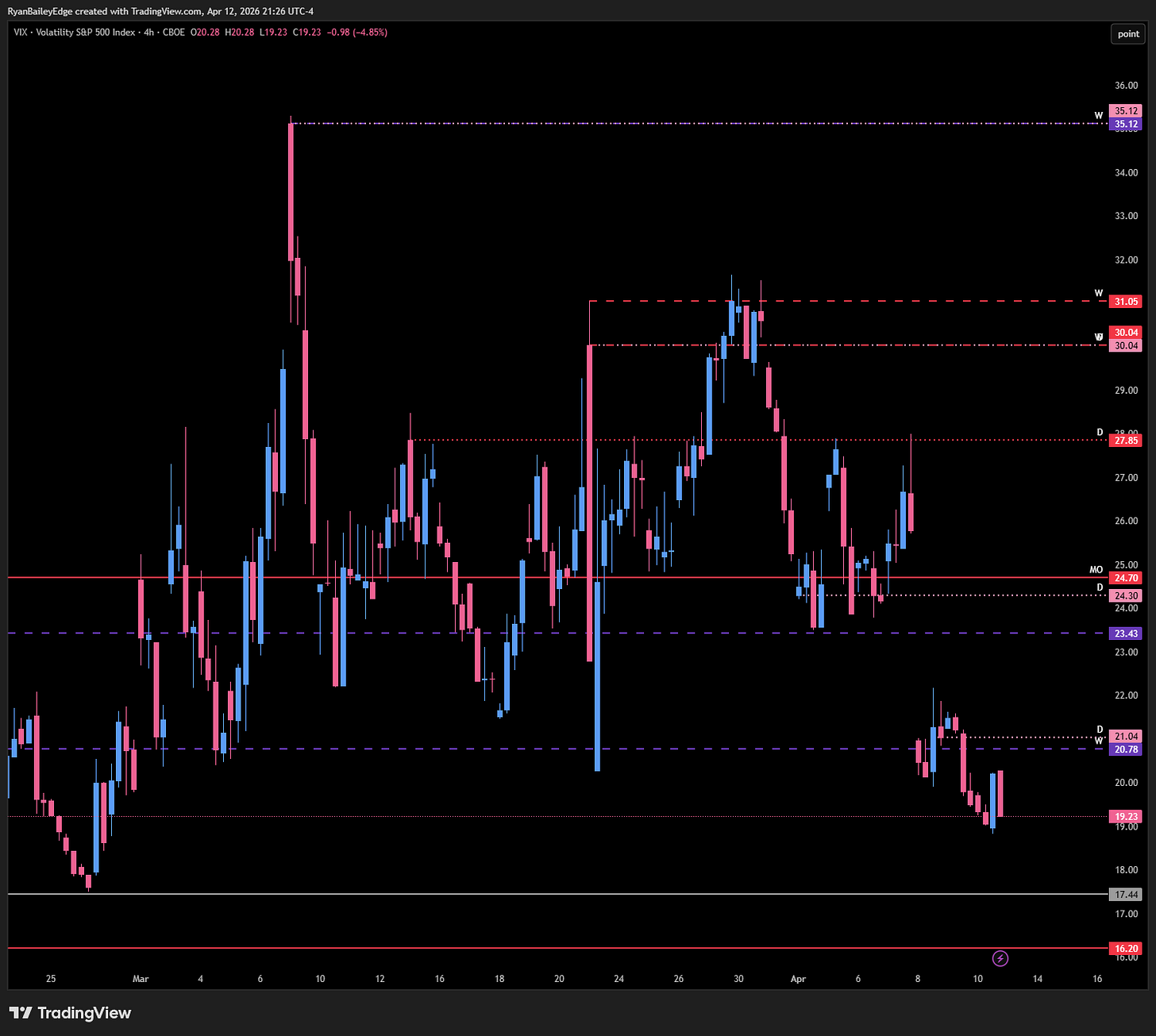 The Headwind Scenario: If VIX pushes above the 21.04 Daily, we start to fill the gap into overhead resistance. Our untested Weekly sits at 23.43, the untested Daily at 24.30, and ultimately our massive Monthly pivot at 24.70. This will more than likely be the ceiling for VIX as these levels are extremely significant and I would expect VIX to remain below them. The market has memory, and so do we — above 24.70, we have nothing untested until the 30s, and you know what happens when we get above this Monthly. It pushes the ES down hardcore.