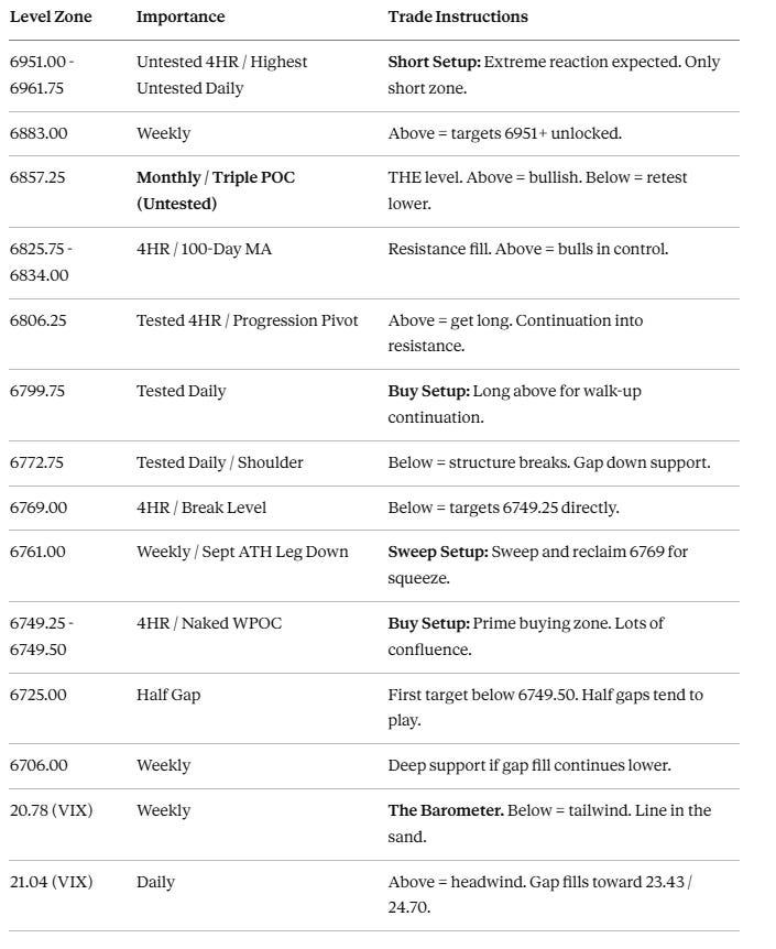 Actionable Setup: If we open tomorrow above 6806.25, we want to get long. Above this, we target 6825.75 and 6834.00, filling in the low volume node and pushing toward the Monthly at 6857.25.