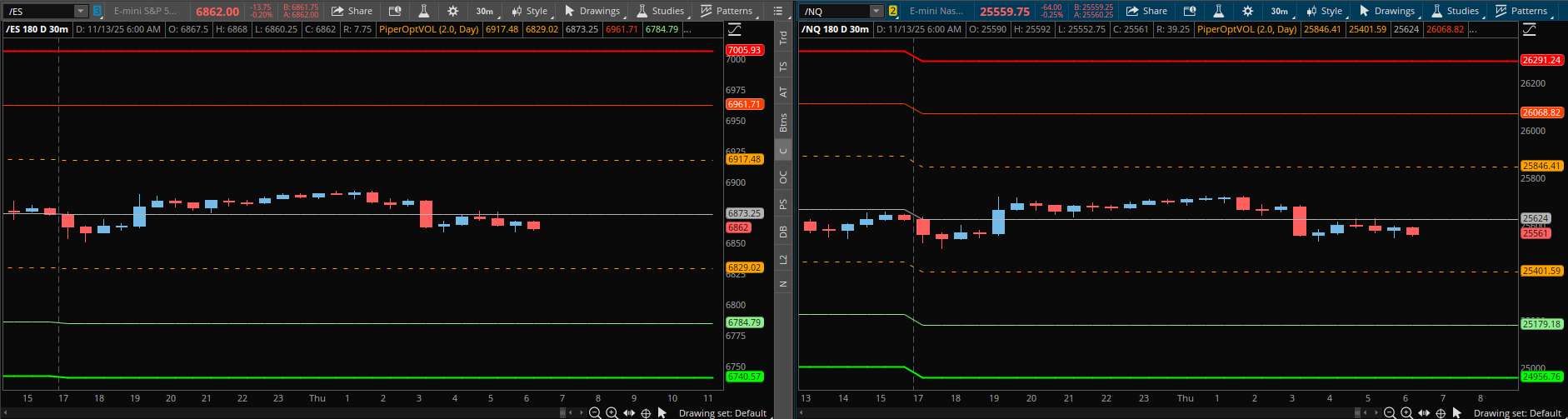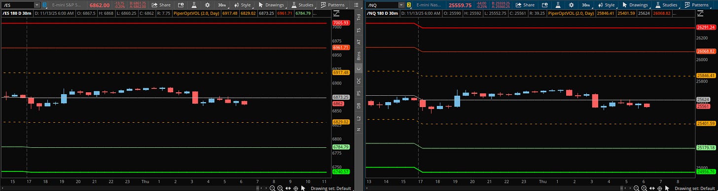 A detailed ES daily trade plan for Nov. 13th, breaking down VIX resistance at 18.01, the “massive” 6822.25 pivot, and a potential short setup at 6908.25.