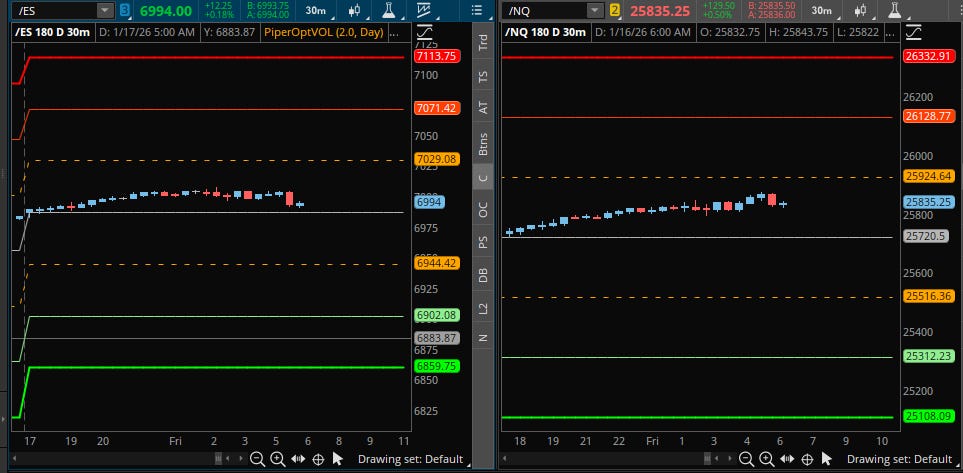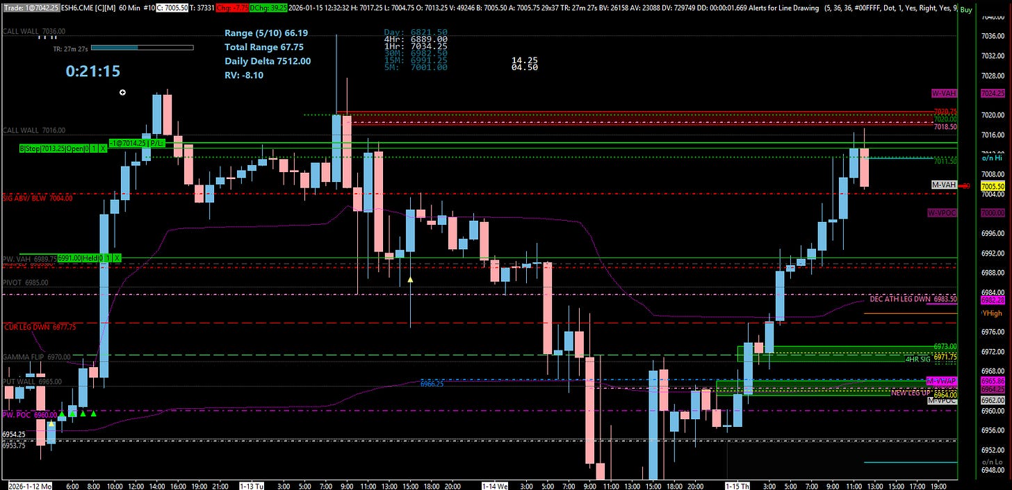 A detailed ES & VIX plan for Jan 16th, breaking down the 7004 inflection point, the 6971 buy zone, and the critical “developing” support at 6964.50.