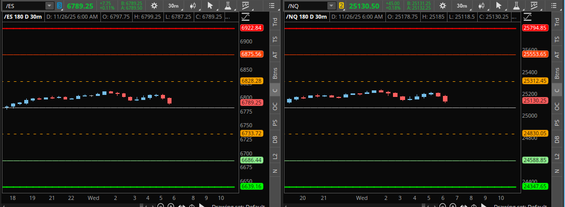 A detailed ES daily plan for Nov. 26th, breaking down the 4-Hour reclaim, the “Fat Zone” at 6765-6761, and the VIX tailwind below 19.13.