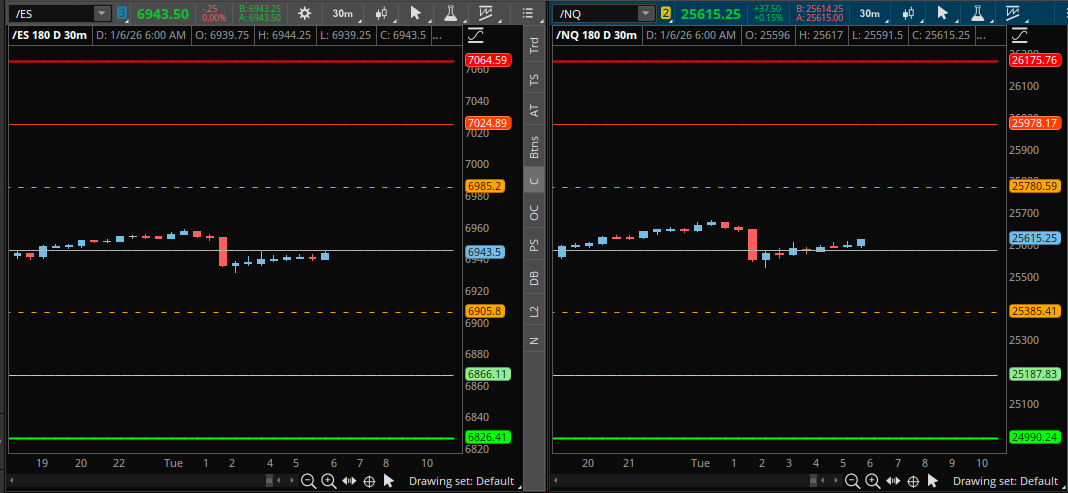 A detailed ES & VIX plan for Jan 6th, breaking down the 6945 Gamma Flip, the 6942 Barometer, and the “Prime” Buy at 6880.25.
