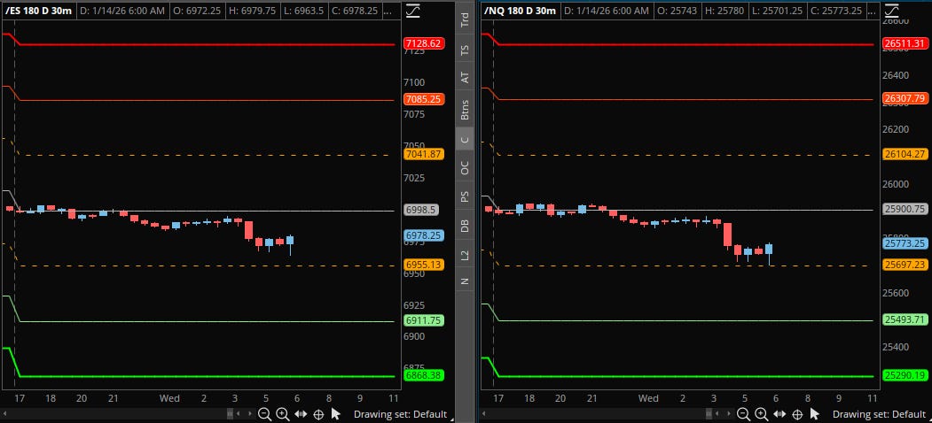 A detailed ES & VIX plan for Jan 14th, breaking down the PPI volatility, the 7000 Gamma resistance, and the “Leg End” buy at 6880.