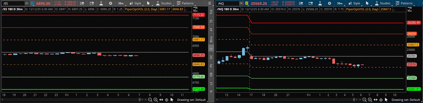 A detailed ES & VIX plan for Dec 12th, breaking down the 6891.25 breakout hold, the “Prime” 6872.00 buy zone, and the VIX floor at 14.93.