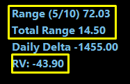 Range: Current range is 14.5 points. Expected move is 72 points, but with low volume, expect ~35 points today (above or below ON High/Low).