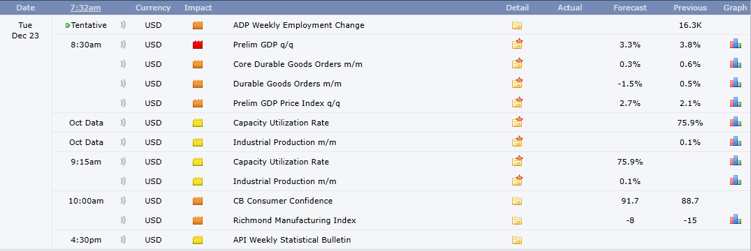 As we come into the last full day before the Christmas holiday, we actually come into a Red Tag event starting at pre-market at 8:30 AM (Preliminary GDP). This could give us a bit of a shake this morning.
