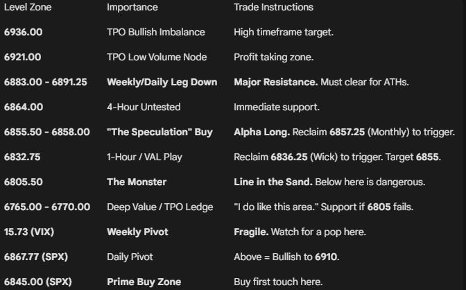 Actionable Setup: This is where “s*** gets real.” If we get below, we are in trouble. If we test here (or 6808.75), we want to see an immediate reclaim of 6813.50 and 6822.00.
