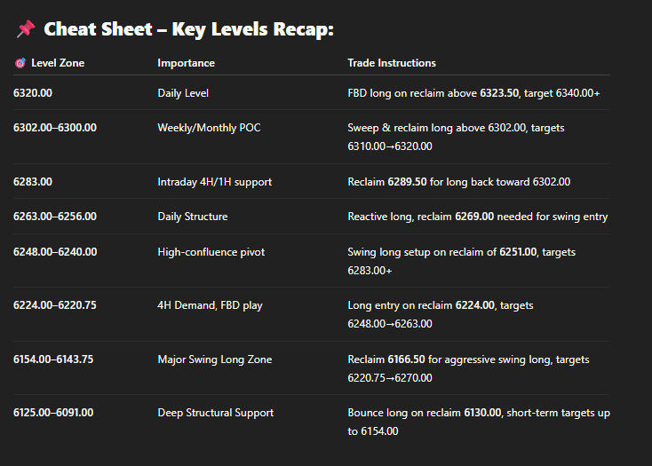 6248.00–6240.00: Daily, 4-hour, Weekly POC confluence. Major pivot and swing zone. Reclaim above 6251.00 confirms bullish reversal.