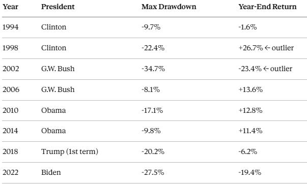 Let’s put the data on the table. Every single midterm year, the president in office at the time, and what the S&P 500 actually did: